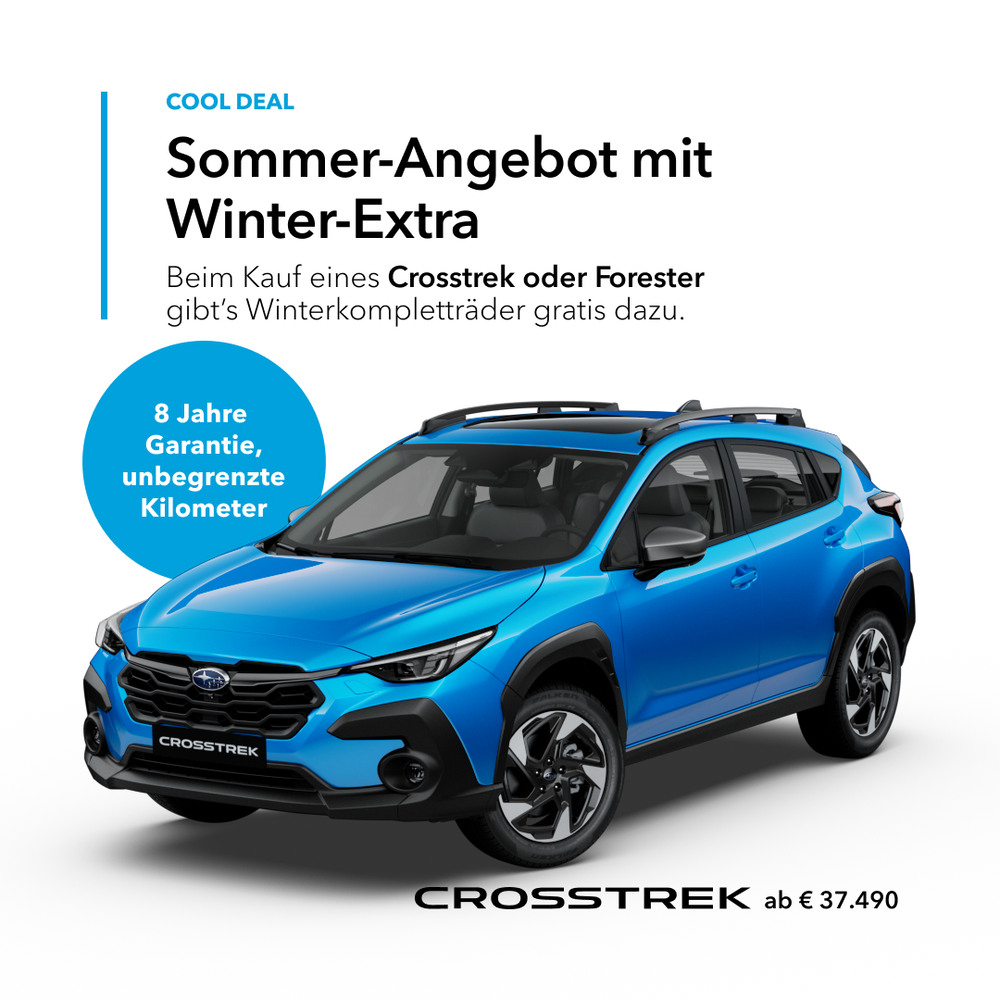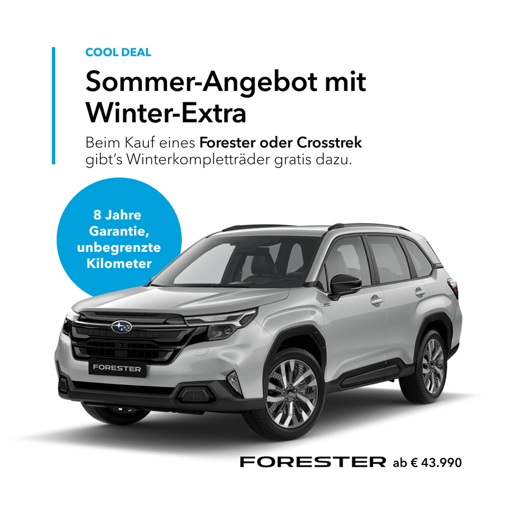 Alle Preise sind unverbindlich empfohlene, nicht kartellierte Aktionspreise inkl. NoVA und 20 % MwSt. Das Angebot gilt ausschließlich bei Kauf eines Subaru Neuwagens aus der aktuellen Forester und Crosstrek Modellreihe und Vertragsabschluss zwischen 01.07.2025 und 30.09.2025. Eine Erstzulassung muss bis 31.12.2025 erfolgen. Preisvorteil für Forester und Crosstrek von bis zu EUR 2.000,– brutto. Das Angebot gilt nur für ausgewählte Reifen-Felgen Kombinationen mit Reifen der Marke Semperit, Aufzahlung bei anderen Kombinationen möglich. Druckfehler, Irrtümer und Änderungen vorbehalten. Symbolfotos. Stand 07/2025. Crosstrek Kraftstoffverbrauch kombiniert: 7,7 l/100 km (WLTP). CO₂-Emissionen: 174 g/km. Forester Kraftstoffverbrauch kombiniert: 8,1 l/100 km (WLTP). CO₂-Emissionen: 183 g/km.